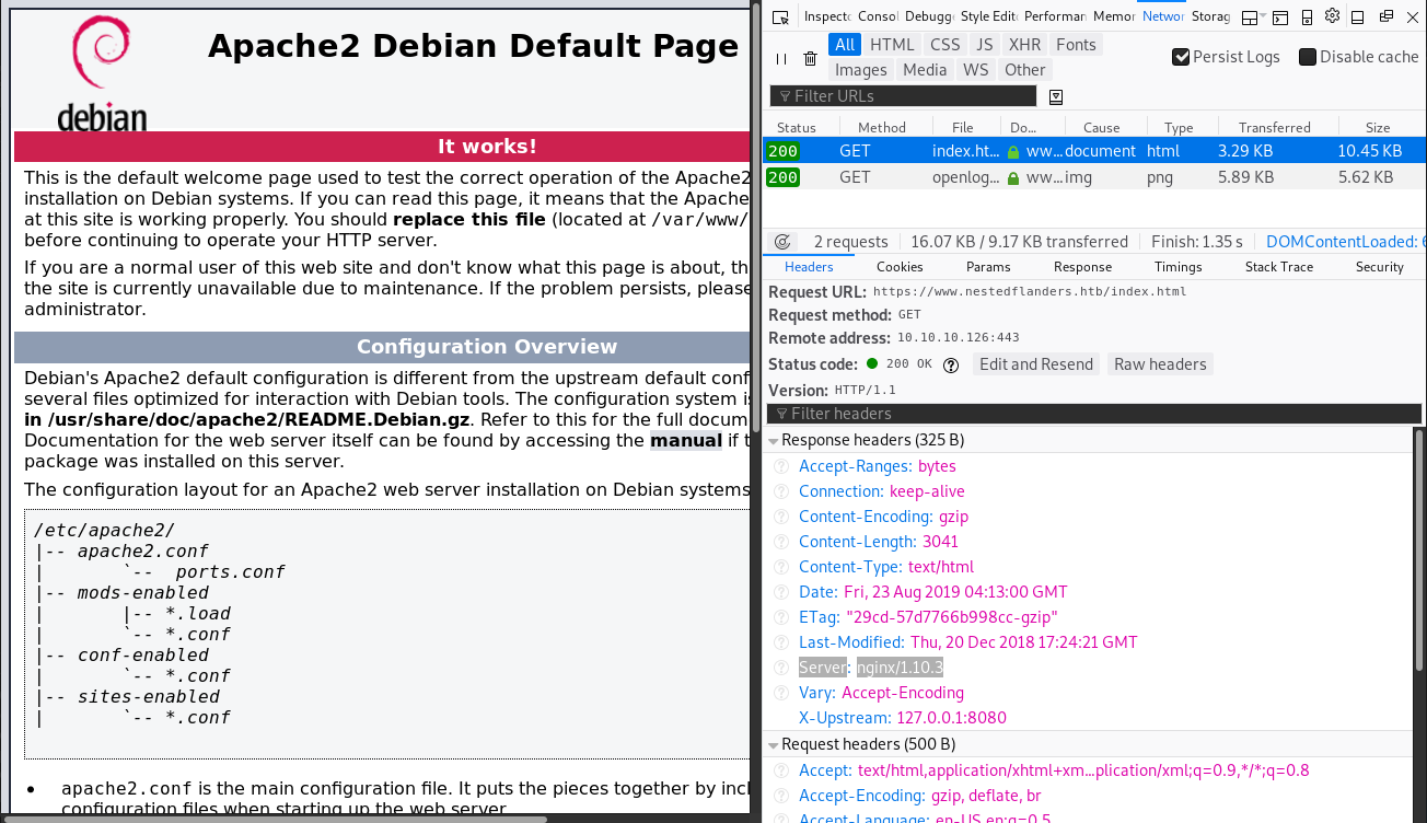 Oddly, the server isn't actually an Apache server. By analyzing the response headers of https://www.nestedflanders.htb/index.html, we can determine that this is a web server running nginx/1.10.3.